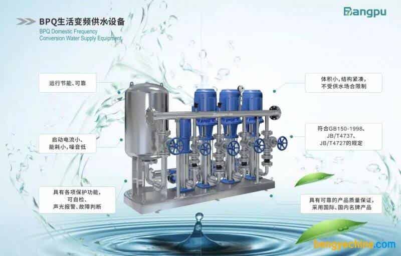 BPQ生活变频供水设备是为供水压力不足需要加压供水,且出水压力比较稳定的要求上发展起来的,主要由增压系统、检测系统、基本配置和智能控制系统等组成。机组在工作时,检测控制、控制系统和增压系统联合作用,通过改变水泵的转速来调整流量和压力,控制出水管路的压力在一定范围内,来实现设备节能的供水要求。主要技术指标增压压力范围、流量和节能指标,均高于国内一般产品,结构设计具新颖性,整体性和智能化程度高,总体水平达到国内领先,国际先进水平。BPQ生活变频供水设备主要特点是保护管网压力、节能、环保、安全、低噪音,在市场上极具竞争力。