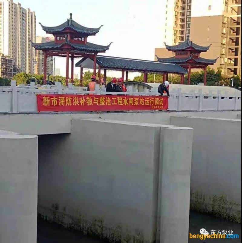 2021年12月1日,新市涌防洪补救与整治工程水闸泵站运行调试。东方泵业3台潜水贯流泵运行调试成功,随着试运行键的按下,正式启动运行。该泵型为东方泵业根据项目需求而设计研发,单机容量1000kW,设计流量16.7m³/s,叶轮直径为2150mm。