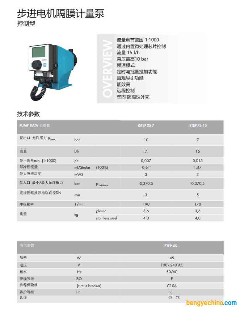 sera iSTEP XSiSTEP S系列步进电机驱动计量泵把智能驱动概念结合到精确隔膜计量泵中,在计量重复精度与可靠性方面创立了新标准。其变频控制技术和大范围流量调节能力(iSTEP XS:0.007-15l/h@10-7bar; iSTEP S:0.02-50l/h@10-3bar,使该系列具备几乎无限的应用可能。使用直观简单,寿命长,特别适合要求严格的计量投加任务。