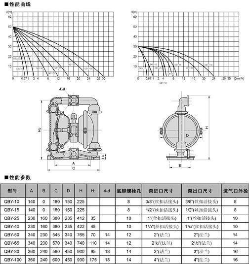 QBY型气动隔膜泵是一种新型输送机械,是目前国内最新颖的一种泵类。采用压缩空气为动力源,对于各种腐蚀性液体,带颗粒的液体,高粘度、易挥发、易燃、剧毒的液体,均能予以抽光吸尽。其性能参数与联邦德国的 WLLDENPVMPS、美国的MARIOWPUMPS相近.本厂目前已形成系列化生 产,共有八种规格直径:¢10mm3/8"、¢15mm1/2"、¢25mm1"、¢40mm11/2"、¢50mm2"、¢65mm21/2"、¢80mm3"、¢100mm4"。四种材质、铝合金、铸铁、工程塑料、不锈钢。根据不同液体介质分别采用丁晴橡胶、氯丁橡胶、氟橡胶、聚四氟乙烯。以满足不同用户的需要。自1986年投产以来,已被国内一千多家石油、化工、电子、陶纺织系统单位采用,安置在种特殊场合,用来抽送各种常规泵不能抽吸的介质,均取的了满意的效果。