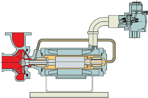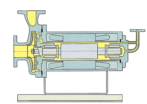 普通离心泵的驱动是通过联轴器将泵的叶轮轴与电动轴相连接,使叶轮与电动机一起旋转而工作,而屏蔽泵是一种无密封泵,泵和驱动电机都被密封在一个被泵送介质充满的压力容器内,此压力容器只有静密封,并由一个电线组来提供旋转磁场并驱动转子。这种结构取消了传统离心泵具有的旋转轴密封装置,故能做到完全无泄漏。